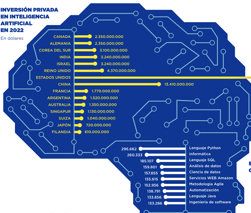 Respecto la inversión privada en IA, una vez más, Estados Unidos el líder, siendo de 47.400 millones de dólares en 2022. Esta cantidad fue aproximadamente 3,5 veces la cantidad invertida en el siguiente país, China (13.400 millones de dólares). Estados Unidos también sigue a la cabeza en cuanto al número total de nuevas empresas de IA financiadas, con 1,9 veces más que la Unión Europea y el Reino Unido juntos, y 3,4 veces más que China.
