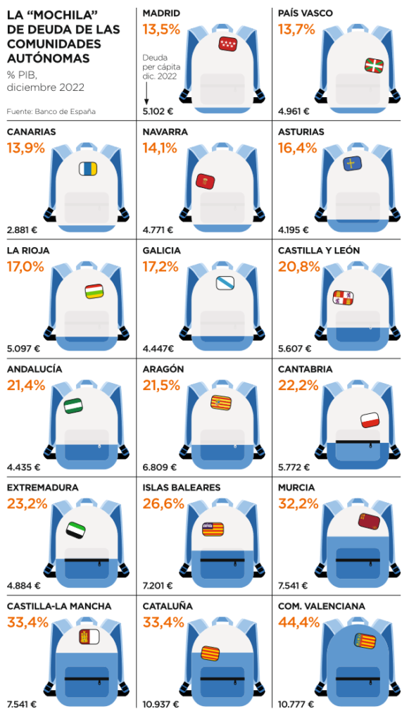 Madrid (13,5%) era la región menos endeudada en 2022. La Comunidad Valenciana (44,4%), la que más.