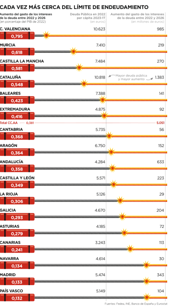El gráfico de hoy muestra dos indicadores: el aumento del gasto que van a suponer los intereses de la deuda autonómica entre 2022 y 2026, y el porcentaje que suponen estos incrementos sobre el PIB de cada Comunidad autónoma, un valor que es el más significativo a futuro. La Comunidad Valenciana es la que está en peor situación a corto plazo, tanto porque aumentará el pago de sus intereses un 0,795% de su PIB en 2026, como porque su deuda total per cápita es de 10.623 euros. Murcia es la región que está en la segunda peor situación(0,618%), seguida de Castilla La Mancha (0,581%) y Cataluña (0,548), que quizá es la Comunidad que está peor, si se tiene en cuenta que la deuda total de cada catalán con AA.PP. es de 10.818 euros. Hace una semanas, la ministra de Hacienda, ante la petición de condonación de los 70.000 millones que adeuda Cataluña por parte de Junts y Esquerra, dijo que si gobierna Sánchez reformará el modelo de financiación autonómica. Espero que no cometa ese error, porque dispararía un déficit, que la UE exige que se reduzca.