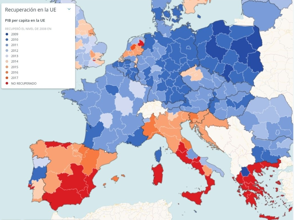 Esto no constituye una novedad. Por ejemplo, España tardó exactamente 9 años en recuperar todo el PIB perdido durante la crisis de 2008. La Gran Recesión dejó una onda expansiva en el país que estuvo presente hasta el segundo trimestre del 2017. Hasta entonces, la economía española ha estado tratando de remontar y, aun así, los efectos perduraron en variables tan destacadas como el empleo. Sin embargo, otros países europeos como Alemania, Reino Unido o Francia tardaron entre 1 y 4 años en restablecer el nivel anterior a dicha crisis. Así pues, exceptuando economías como Italia, con la que, de acuerdo con Tortella, encontramos grandes semejanzas de comportamiento, la española se trató de una de las economías a las que más les costó superar dicha recesión. Unas diferencias que quedan registradas en el siguiente mapa, publicado por el portal estadístico de la Unión Europea (Eurostat).