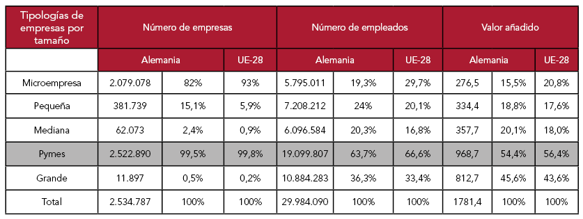 Tabla 2. Nº de empresas, empleados, y Valor Agregado Bruto (VAB) por tamaño de empresa en Alemania (2019)