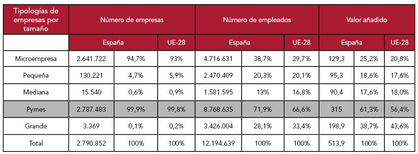 El tejido productivo español se caracteriza por el hecho de que las pequeñas y medianas empresas ocupan en él un lugar muy destacado. Así, las pymes representan el 99,88%, dejando un exiguo 0,12% a las grandes compañías. Esto muestra esa primera problemática de nuestro tejido productivo: únicamente se ha centrado en la creación de muchas empresas, descuidando otros aspectos quizá más importantes, como veremos en el análisis, como hacerlas crecer. Sin embargo, hay que resaltar que este dato, si lo comparamos con otras economías de la Unión Europea, es bastante poco representativo, al no guardar grandes diferencias respecto a ellas. Y es que, aunque sea bastante importante, se trata de un dato relativo, que muestra la proporción. Por esta razón, para ganar en precisión, debemos analizar los datos absolutos. No obstante, incluso los relativos presentan un diferencial que llama la atención: las grandes empresas, es decir, las que emplean a más de 250 trabajadores, suponen el 0,12% del total del tejido empresarial español, mientras que en Alemania ascienden hasta el 0,47%. Esto es, cuatro veces más.