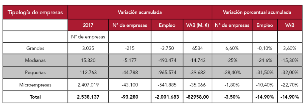 Así pues, en esta tabla se prueba que las empresas pequeñas y medianas son más vulnerables ante cualquier recesión económica, a la vez que demuestran entonces una mayor propensión a destruir empleo. Teniendo en cuenta que, como se señalaba en el apartado anterior, este grupo de empresas aglutina a cerca del 72% de los trabajadores, así como un gran porcentaje del tejido empresarial y el VAB, su desaparición afecta más significativamente a nuestra economía que a otras menos dependientes de ellas.