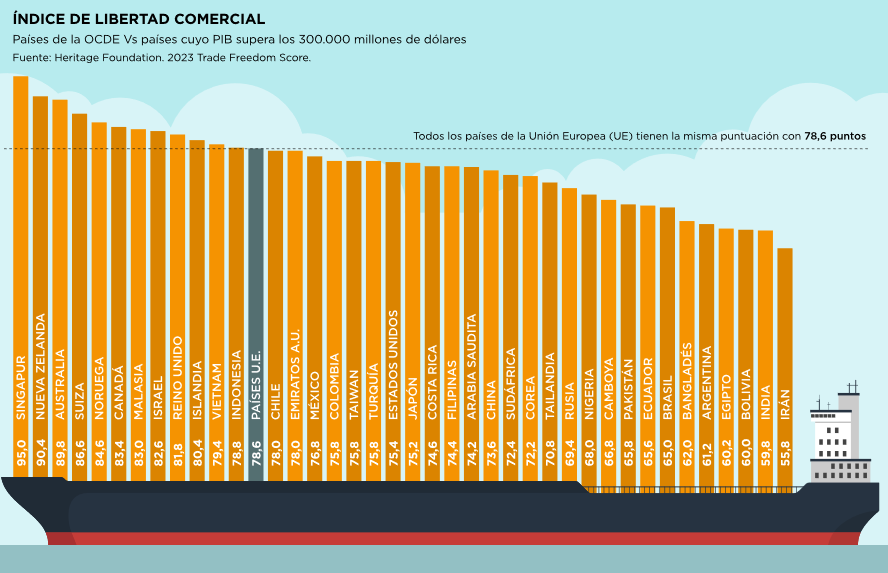 Obviamente todos los países de la Unión Europea (UE) tienen la misma puntuación, lo que es muy útil para comparar la libertad económica del conjunto de la UE con el resto del mundo. Singapur, con 95,0 puntos, es el país con mayor libertad comercial del mundo, seguido de Nueva Zelanda (90,4), Australia (89,8), Suiza (86,6) y Noruega (84,6). Los países peor clasificados son: Irán (55,8), India (59,8) y Bolivia (60,0). Las naciones de la UE obtienen 78,6 puntos, un valor menor que el esperado, si se tiene en cuenta que su comercio comunitario interior no requiere arancel alguno. Esto sugiere que la política del tráfico de bienes y servicios entre la UE y el exterior debe mejorar. Curiosamente, la salida del Reino Unido de la UE ha mejorado su libertad económica.