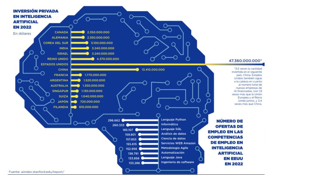 Respecto la inversión privada en IA, una vez más, Estados Unidos el líder, siendo de 47.400 millones de dólares en 2022. Esta cantidad fue aproximadamente 3,5 veces la cantidad invertida en el siguiente país, China (13.400 millones de dólares). Estados Unidos también sigue a la cabeza en cuanto al número total de nuevas empresas de IA financiadas, con 1,9 veces más que la Unión Europea y el Reino Unido juntos, y 3,4 veces más que China.