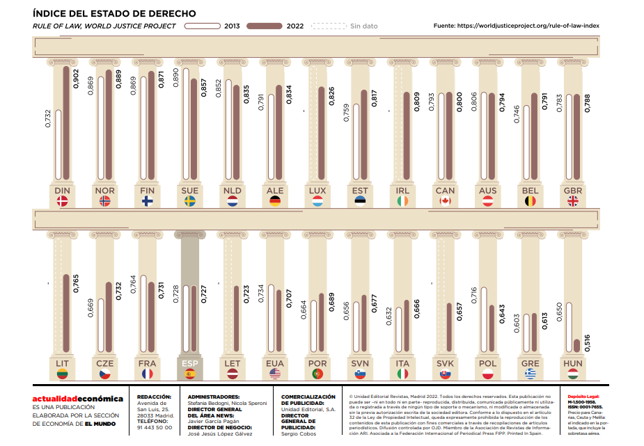 El Índice del Estado de Derecho (Rule of Law Index) es la mejor referencia para un análisis de la salud de las democracias. Los cuatro principios que inspiran esta clasificación son: A) La rendición de cuentas ante la ley de gobiernos y agentes privados. B) Unas leyes justas, claras y estables que son aplicadas de forma equitativa. C) Un gobierno abierto y transparente. Y D) Mecanismos accesibles e imparciales para resolver conflictos. Por su parte, los ocho factores que cuantifican esos objetivos son: 1) Los límites puestos a las instituciones gubernamentales y la separación de los tres poderes; 2) Orden y Seguridad (incluye el control efectivo de la delincuencia); 3) Cumplimiento Regulatorio (mide si hay sobornos en la adjudicación de servicios públicos, el retraso injustificado de los procedimientos y si el Gobierno respeta el derecho de propiedad); 4) Ausencia de Corrupción; 5) Gobierno Abierto y Transparente; 6) Derechos fundamentales; 7) Justicia Civil; y 8) Justicia Penal.