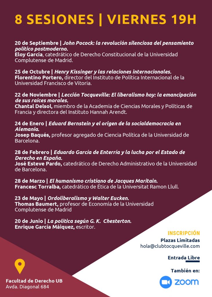 El Club Tocqueville organiza, con el patrocinio de la Fundación Konrad Adenauer y la colaboración de la Fundación Civismo y GEDECO (Grupo de Estudios sobre Democracia y Constitucionalismo) de la Universidad de Barcelona, el VII Seminario «Siglo XX y Pensamiento Político». Aquí puedes consultar el programa completo.