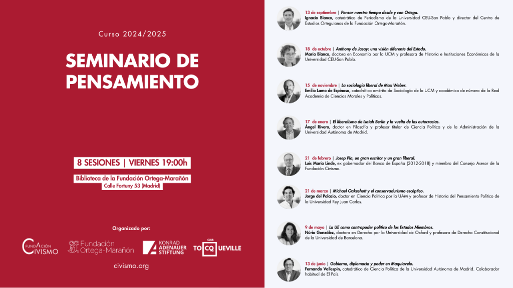 Tras el éxito de la edición pasada, la Fundación Civismo presenta en el curso 2024/2025 la nueva edición del Seminario de Pensamiento, organizado junto a la Fundación Ortega-Marañón, la Fundación Konrad Adenauer y el Club Tocqueville. El «Seminario de Pensamiento de los Viernes» es un espacio dedicado a la reflexión y el diálogo, donde exploramos ideas y pensadores que nos ayudan a comprender la sociedad actual y entender el mundo del mañana. Algunos de vosotros nos habéis preguntado por qué elegimos los viernes por la tarde para estos encuentros. La respuesta es simple: la filosofía florece cuando hay tiempo para el ocio, ese momento de descanso que nos permite detenernos, contemplar y profundizar en la comprensión del mundo. Para muchos, el viernes por la tarde marca el inicio del fin de semana, el primer momento de respiro tras la semana laboral, ideal para pensar con serenidad y apertura.