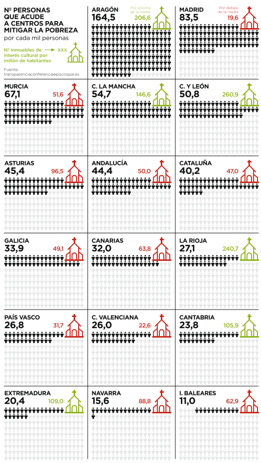 La actividad caritativa y asistencial de la Iglesia la realizan sus 8.864 centros, en los que reciben ayuda cada año más 3,9 millones de personas necesitadas. Estos establecimientos son muy variados, siendo los más abundantes las 877 casas para ancianos, enfermos crónicos y personas con discapacidad y, sobre todo, los 6.309 centros para mitigar la pobreza. El número de beneficiados, en términos relativos, de estas instituciones, dedicadas en buena parte a repartir alimentos, es muy diferente. Impresiona que en 2021 hayan pasado por los centros de Aragón 164,5 indigentes por cada mil habitantes de esa región. Le sigue Madrid (83,5) y Murcia (67,1). Los lugares con menor afluencia fueron Baleares (11,0) y Navarra (15,6).