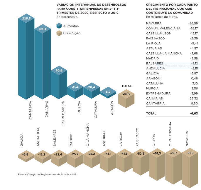 Si comparamos los desembolsos para constituir empresas en el segundo y tercer trimestre de 2020 con el mismo período de 2019, se puede determinar cómo ha golpeado el covid a cada comunidad. En total, se han dejado de invertir 658,64 millones, es decir, un 28,19% menos. Navarra es la comunidad en la que, en proporción, más ha bajado la inversión societaria: un 91,54%, seguida de Valencia (79,76%) y Castilla y León (68,35%). Por el contrario, ha crecido en Cantabria (226,52%), Canarias (195,43%) y Extremadura (70,91%).